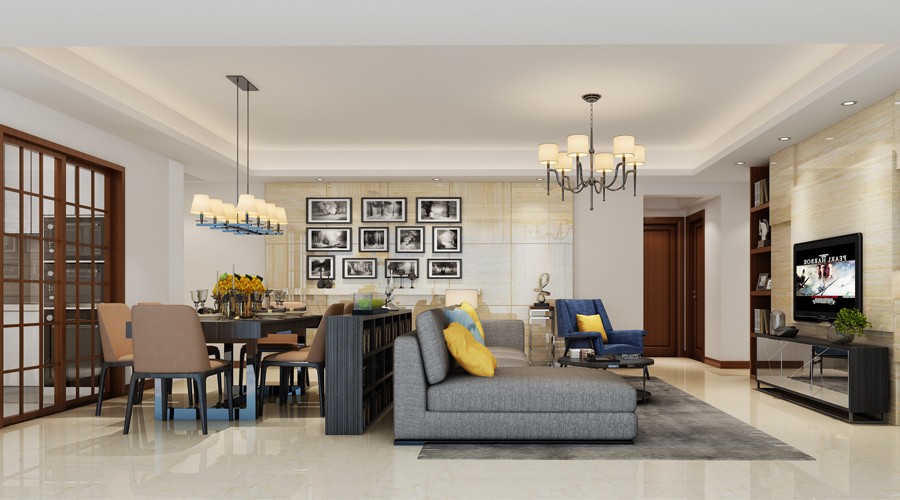 客廳與餐廳以一面低矮書柜進行劃分,既可作小型書架,讓客廳也能有書房的屬性;又可作為餐邊柜,擺放些好看的裝飾物,點綴用餐時光~