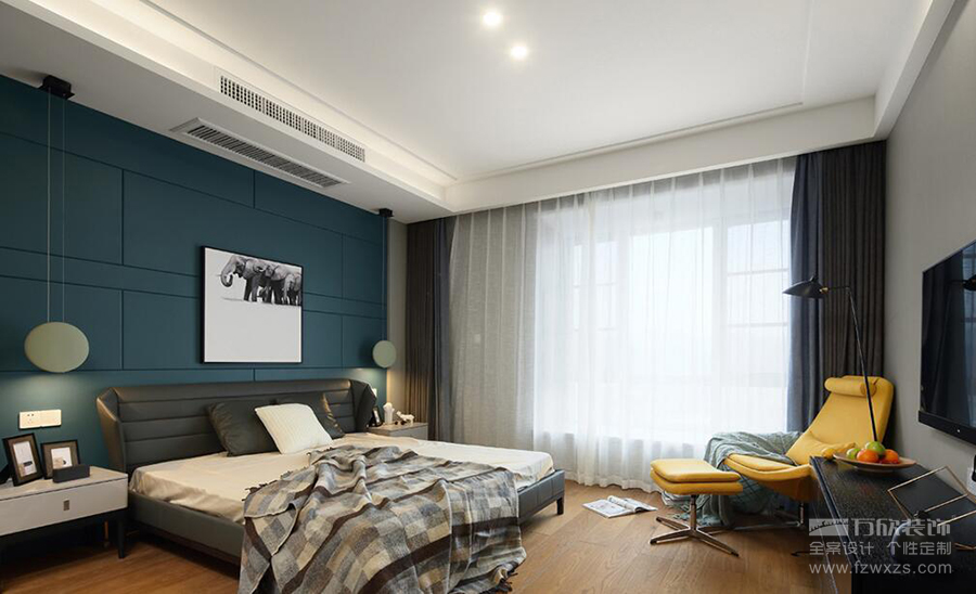 深藍色的床頭背景似一面靜謐深邃的海,直把人拉向睡眠最深處。大面積的落地玻璃窗讓陽光很好的滲入室內(nèi),整個空間明亮通透,陽光正好的午后,可以倚在黃色的躺椅上,翻翻雜志,發(fā)發(fā)呆,任時間流淌~
