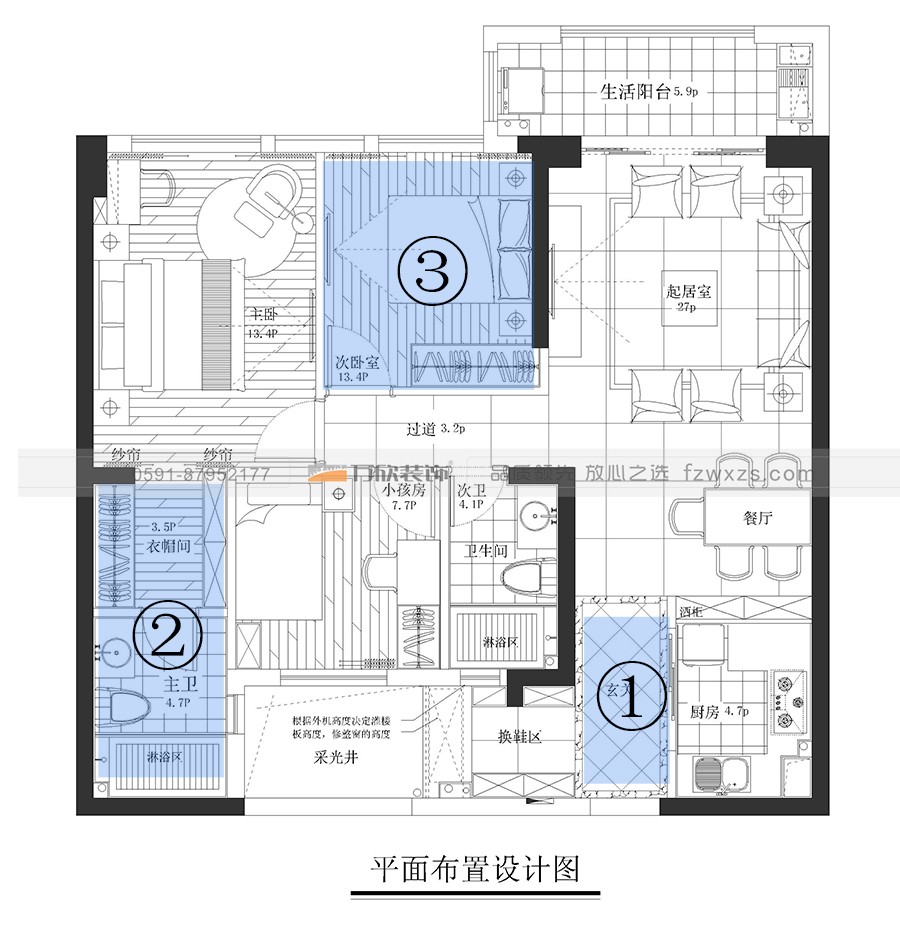 ② 主臥連通衣帽室、主衛(wèi)設(shè)計成大套間,提升了空間舒適感;