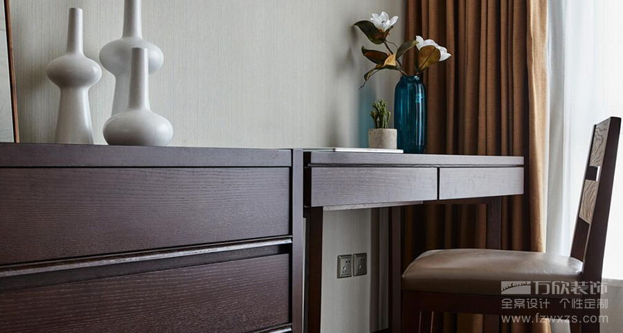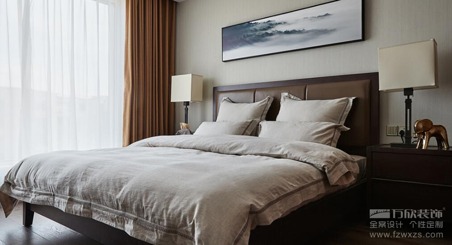 主臥擁有絕佳的采光條件,充沛的光線讓暗色的實木床頭也不顯壓抑。一卷山水畫掛于床頭,充滿線條感的簡潔家具擺放在室內(nèi),讓利落的現(xiàn)代感與質(zhì)樸的自然氣息,巧妙融合在這個空間。