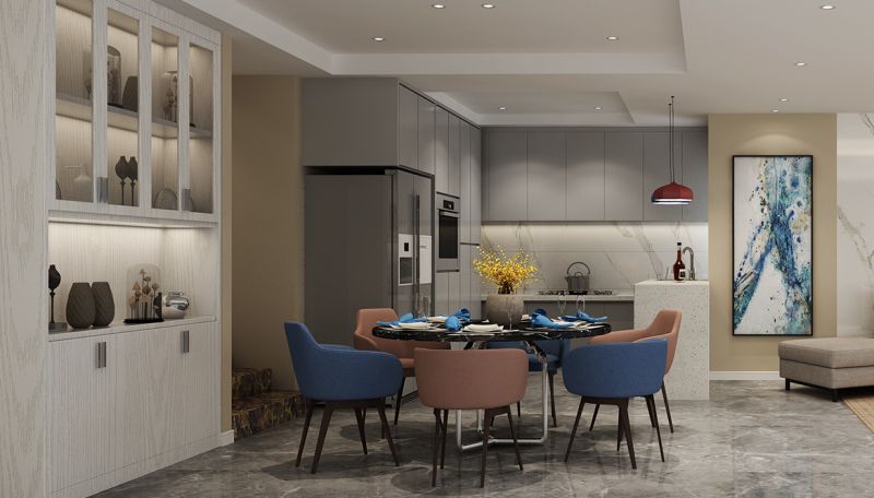 設計理念|本案在整體設計效果上,采用簡約現(xiàn)代的手法設計,主色使用灰白色系,再加以米白色提亮整個空間溫度,用藍色的餐椅和吧臺燈點綴空間色彩。造型上,客廳電視背景墻采用立體石塊,增加空間立體感受。裝飾上,一切從功能出發(fā),講究造型比例適度、空間結構圖明確美觀,強調(diào)外觀的明快、簡潔。體現(xiàn)了現(xiàn)代生活快節(jié)奏、簡約和實用,但又富有朝氣的生活氣息。