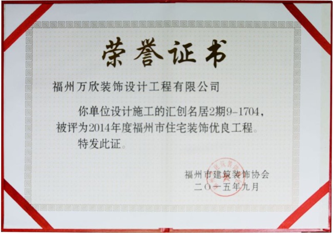 - >匯創(chuàng)名居2期9-1704被福州市建筑裝飾協(xié)會評為2014年度福州市住宅裝飾"優(yōu)良工程"