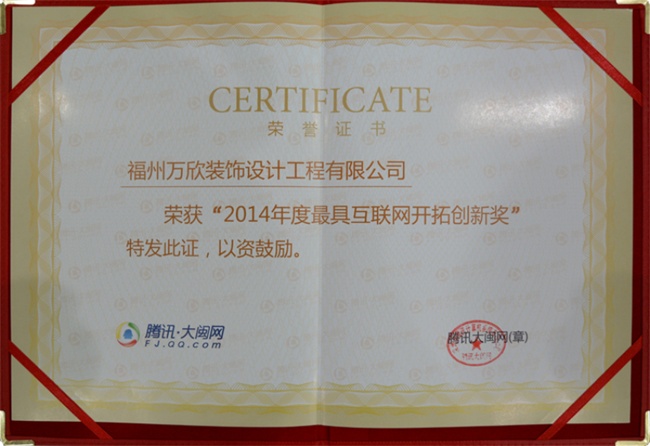 - >騰訊大閩網(wǎng)授予萬欣裝飾"2015·互聯(lián)網(wǎng)營銷創(chuàng)新獎"