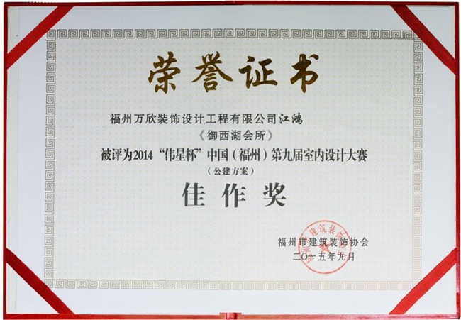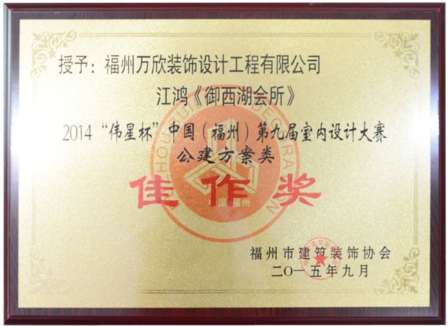 - >萬欣裝飾作品《御西湖會所》被評為中國(福州)第九屆室內(nèi)設(shè)計大賽(公建方案)佳作獎