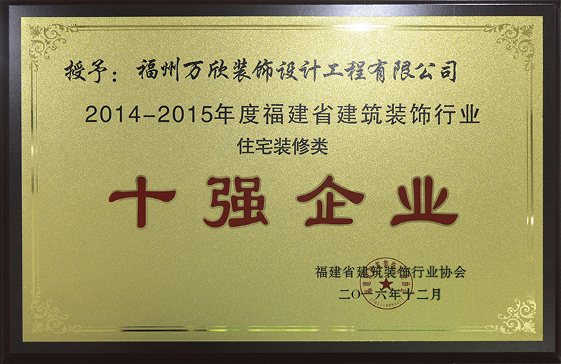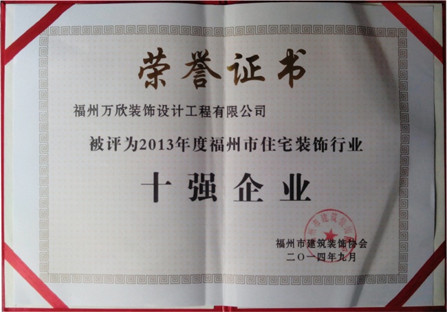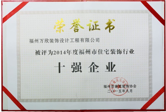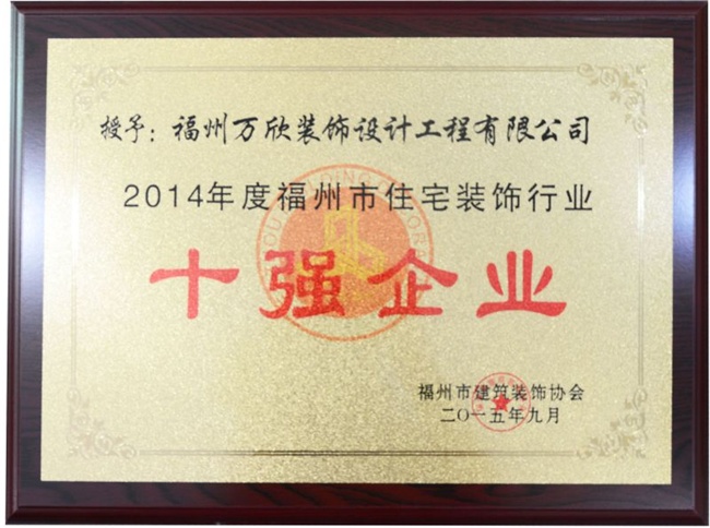 - >福州市建筑裝飾協(xié)會授予萬欣裝飾2014年度福州市住宅裝飾行業(yè)十強企業(yè)