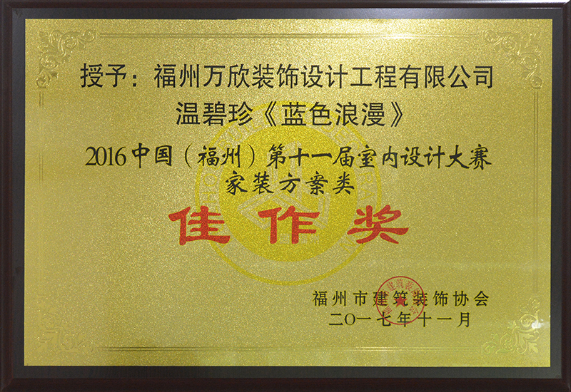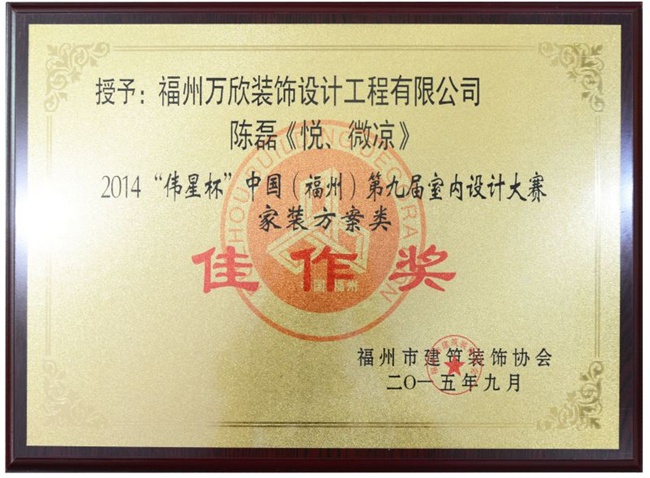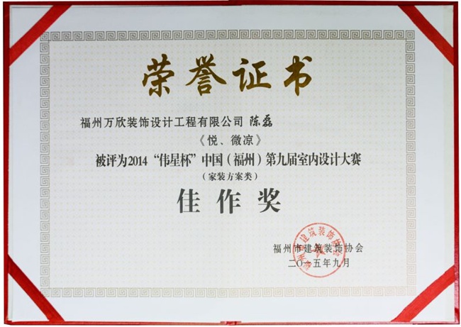 - >萬欣裝飾作品《悅、微涼》被評為中國(福州)第九屆室內(nèi)設(shè)計大賽(家裝方案類)佳作獎