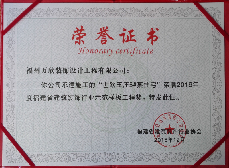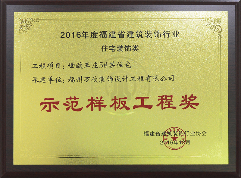 - >“世歐王莊5#某住宅”榮膺2016年度福建省建筑裝飾行業(yè)示范樣板工程獎