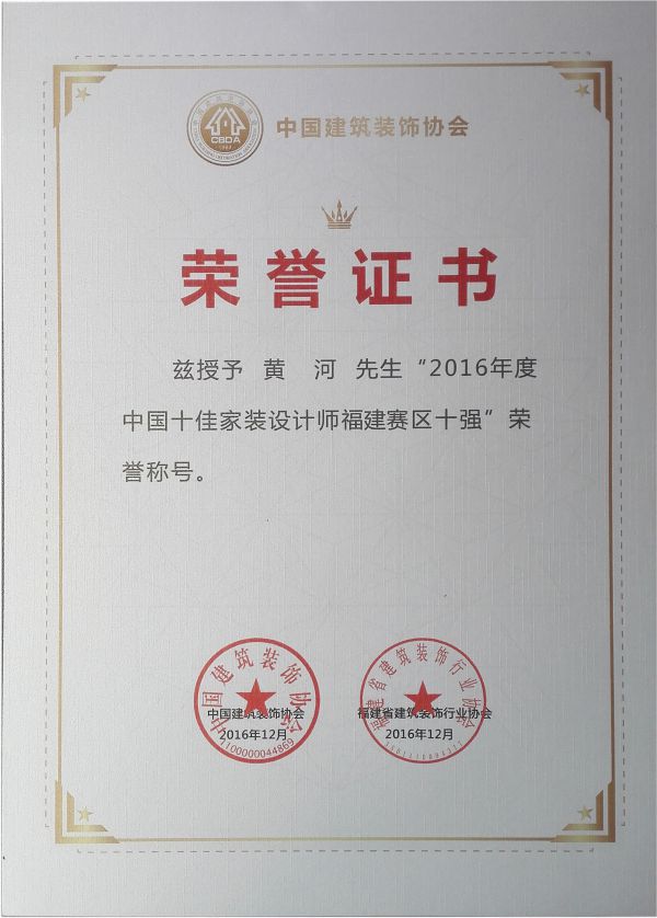 - >黃河榮獲“2016年度中國十佳家裝設(shè)計師福建賽區(qū)十強”稱號