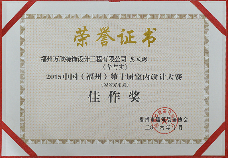 - >萬欣裝飾作品《華與實》被評為中國(福州)第十屆室內(nèi)設(shè)計大賽(家裝方案類)佳作獎