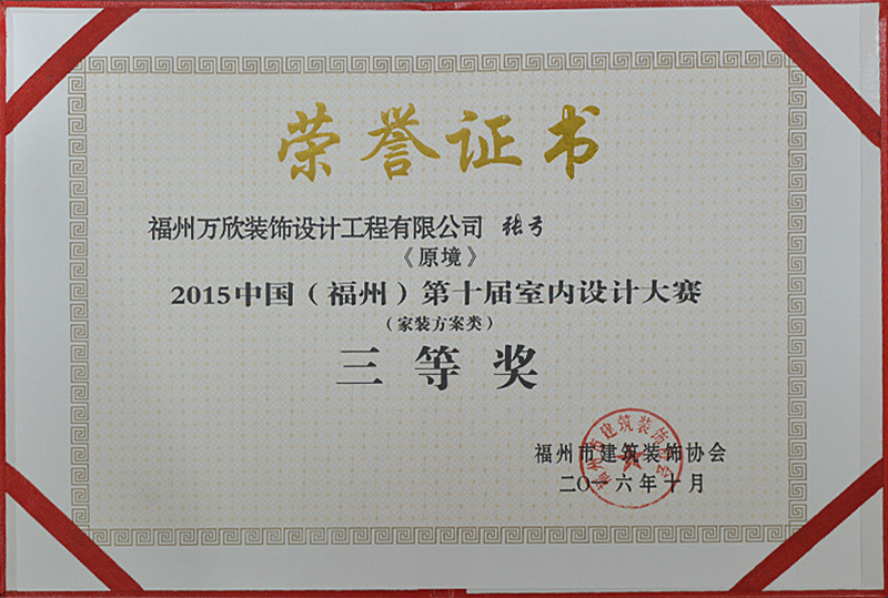 - >萬欣裝飾作品《原境》被評為中國(福州)第十屆室內(nèi)設(shè)計大賽(家裝方案類)三等獎