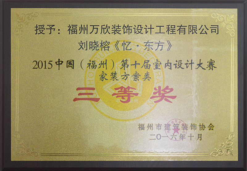 - >萬欣裝飾作品《憶·東方》被評為中國(福州)第十屆室內(nèi)設(shè)計大賽(家裝方案類)三等獎