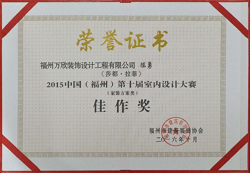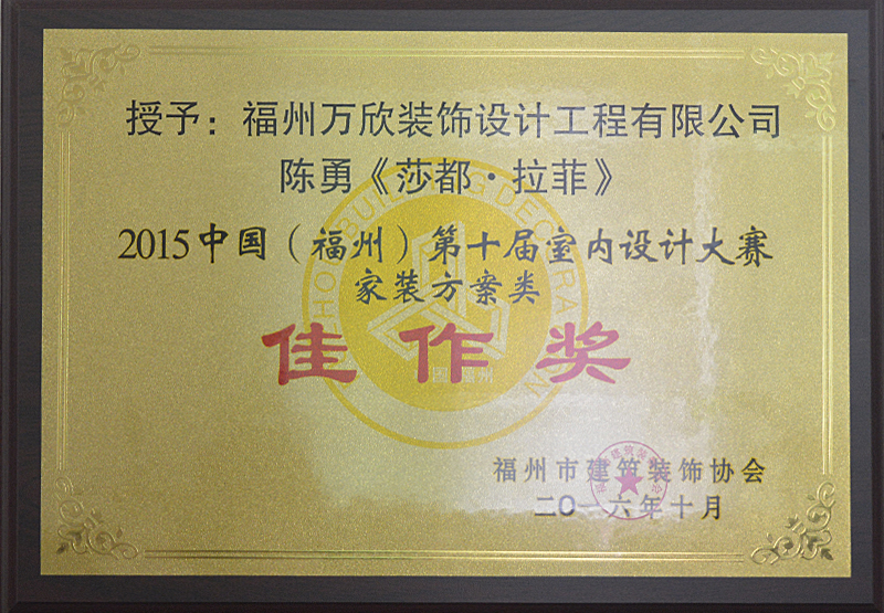 - >萬欣裝飾作品《莎都·拉菲》被評為中國(福州)第十屆室內(nèi)設(shè)計大賽(家裝方案類)佳作獎