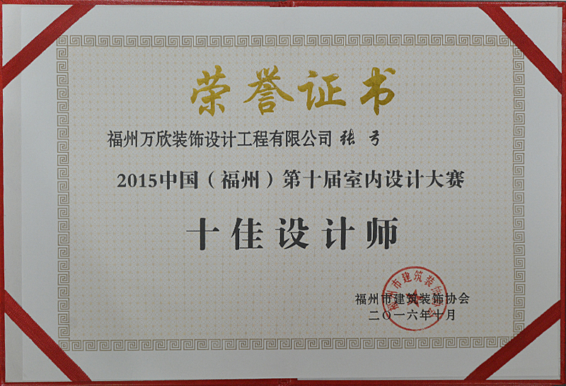 - >萬欣裝飾設(shè)計師張弓被評為中國(福州)第十屆室內(nèi)設(shè)計大賽十佳設(shè)計師