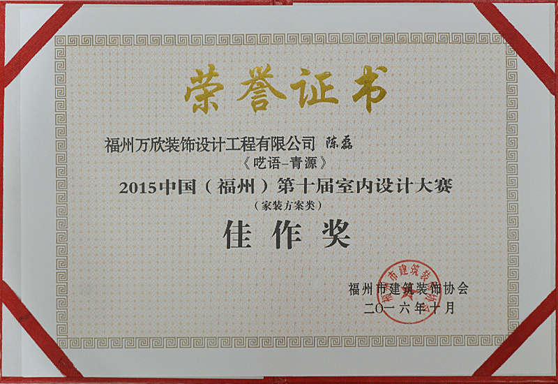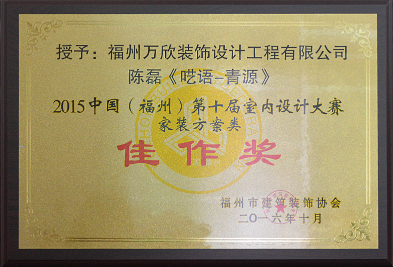 - >萬欣裝飾作品《囈語·青源》被評為中國(福州)第十屆室內(nèi)設(shè)計大賽(家裝方案類)佳作獎