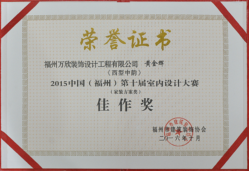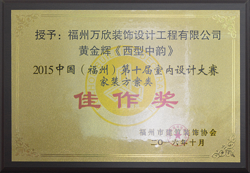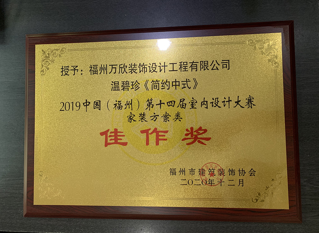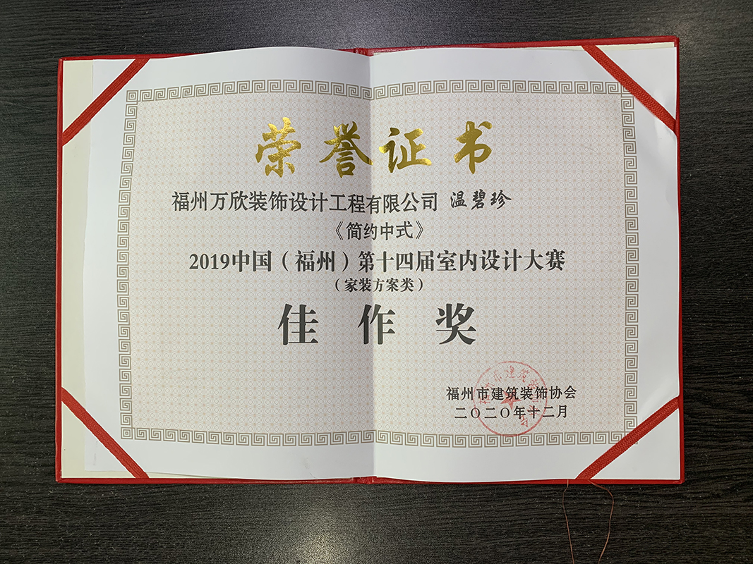 - >萬欣裝飾作品《簡約中式》被評為中國(福州)第十四屆室內(nèi)設(shè)計大賽(家裝方案類)佳作獎