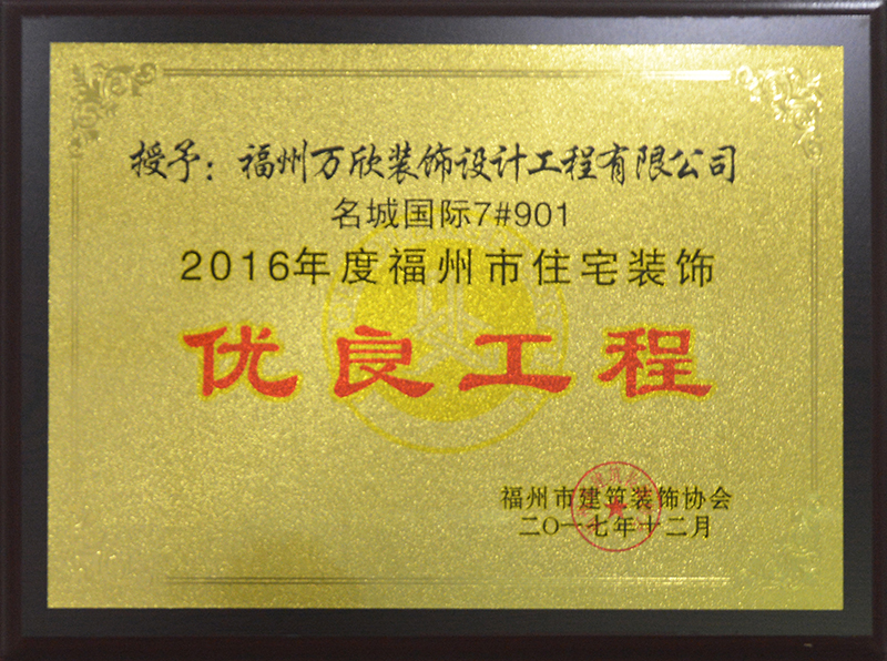 - >萬欣裝飾“名城國際7#901”被福州市裝協(xié)評選為優(yōu)良工程