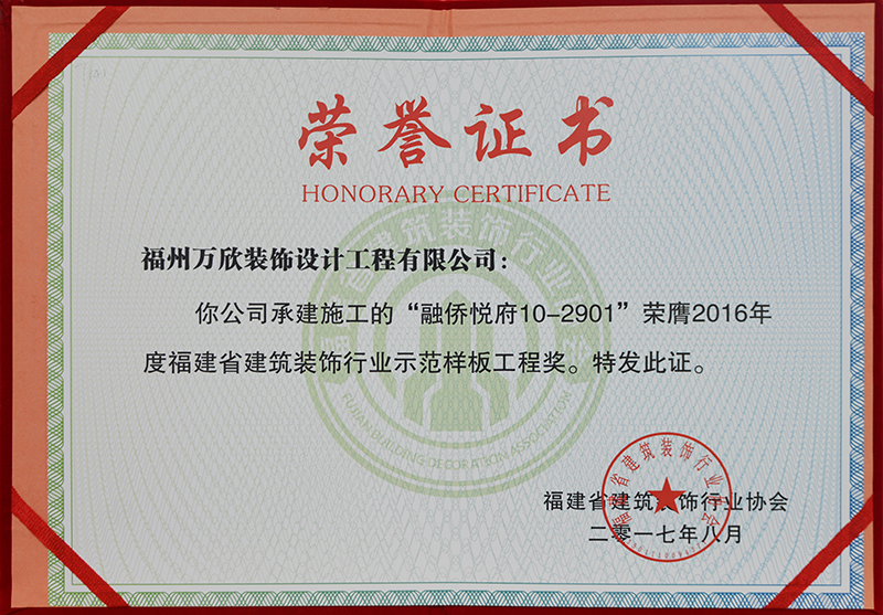 - >萬欣裝飾“融僑悅府10#2901”被福建省裝協(xié)評為示范樣板工程獎