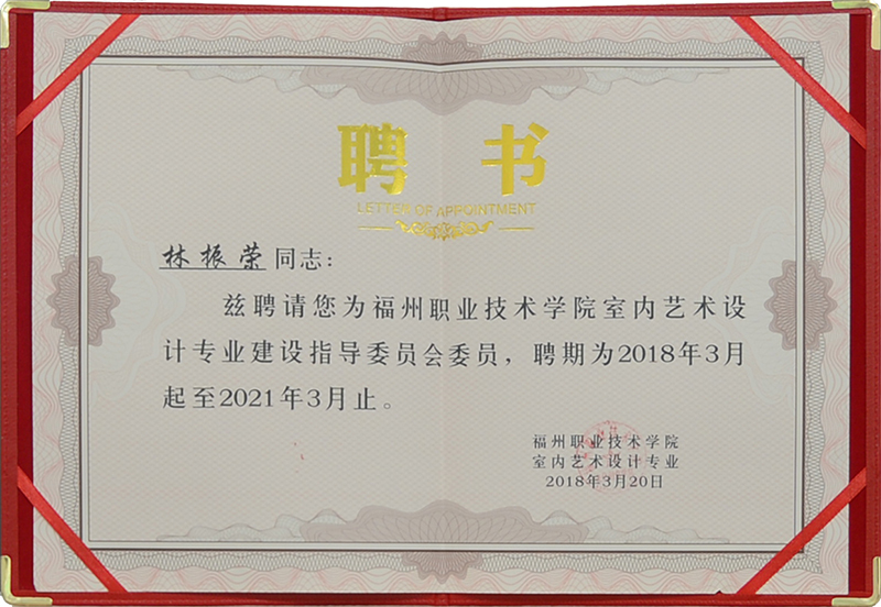 - >聘請林振榮為福州職業(yè)技術(shù)學(xué)院室內(nèi)藝術(shù)設(shè)計專業(yè)委員會委員