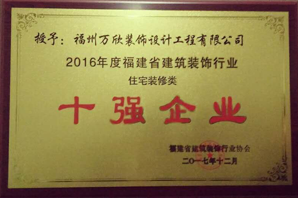 - >萬欣裝飾榮獲2016年度福建省建筑裝飾行業(yè)住宅類裝修十強企業(yè)