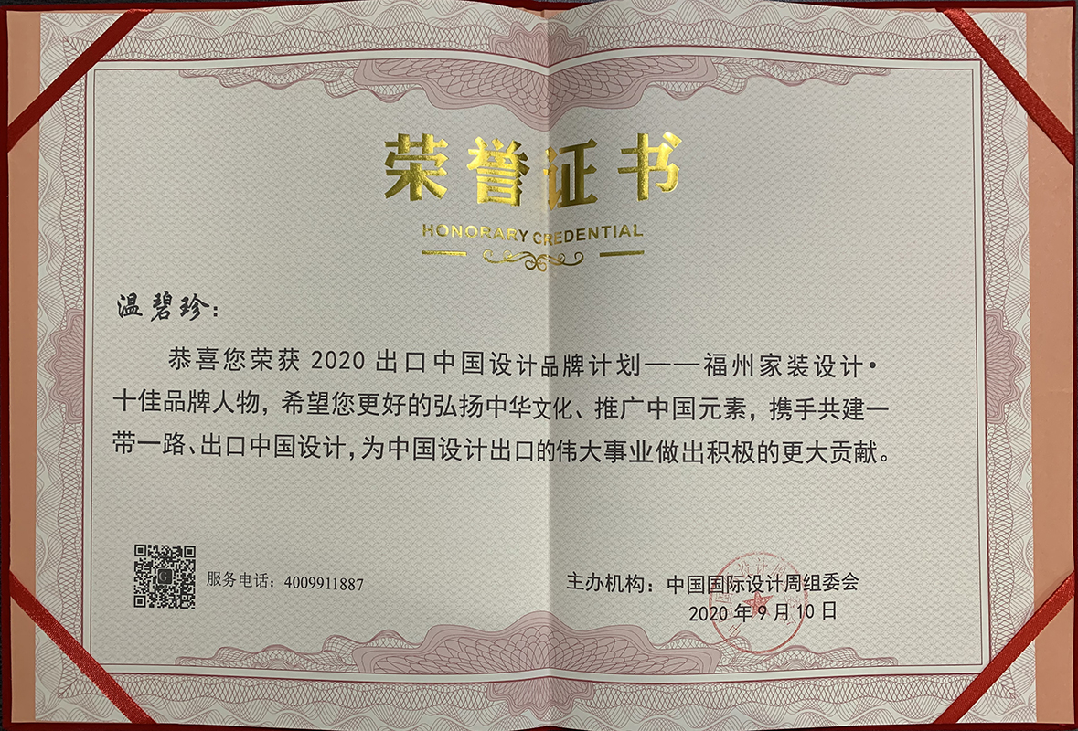 - >萬欣裝飾設(shè)計師溫碧珍榮獲2020出口中國設(shè)計品牌計劃——福州家裝設(shè)計·十佳品牌人物