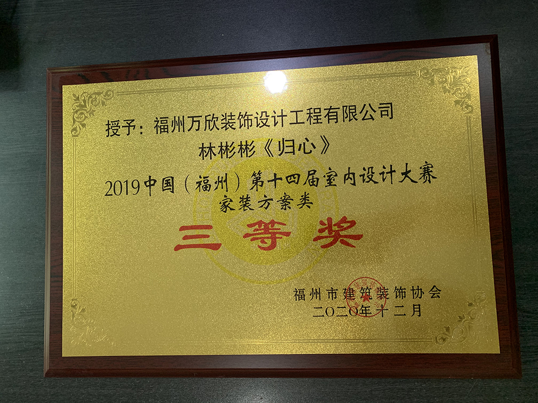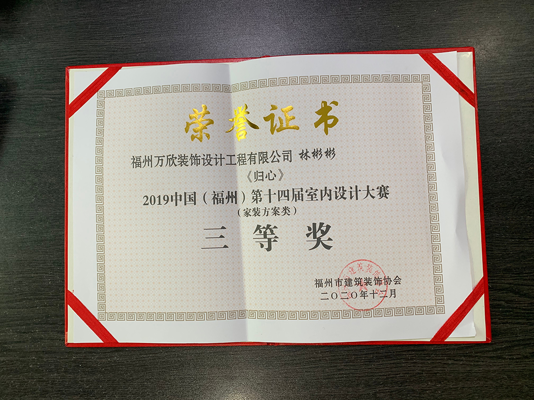 - >萬欣裝飾作品《歸心》被評為中國(福州)第十四屆室內(nèi)設(shè)計大賽(家裝方案類)三等獎