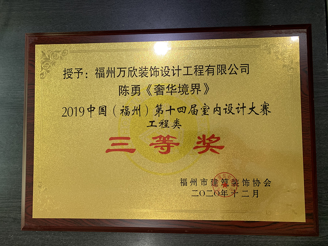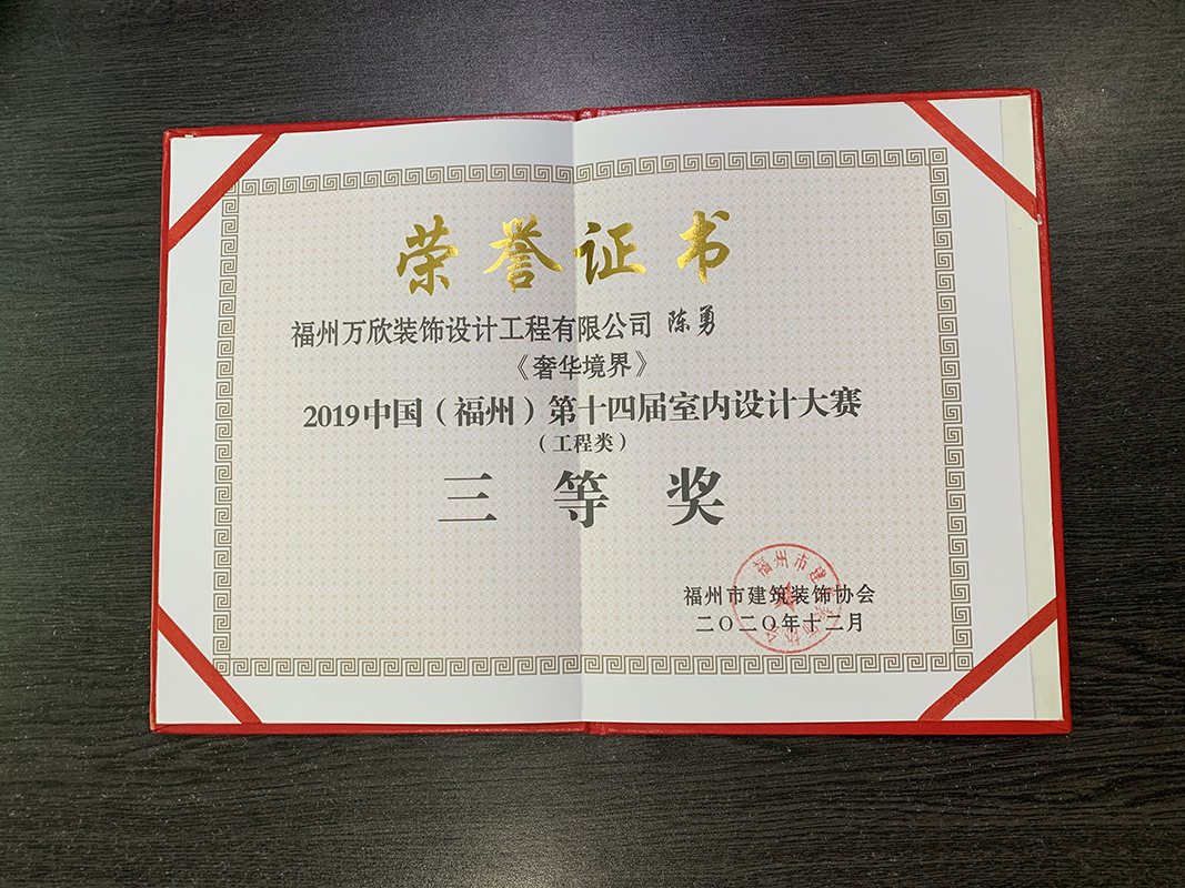 - >萬欣裝飾作品《奢華境界》被評為中國(福州)第十四屆室內(nèi)設(shè)計大賽(工程類)三等獎