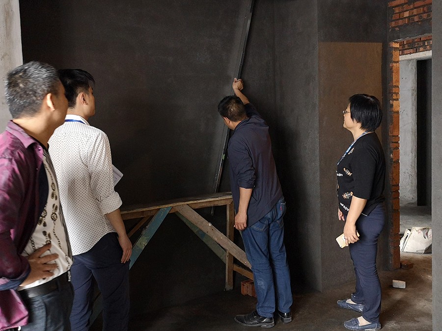 ▲檢查新砌墻體的垂直度