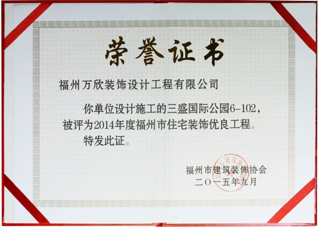 - >萬欣裝飾“閩江印象3#1902”被福州市裝協(xié)評選為優(yōu)良工程