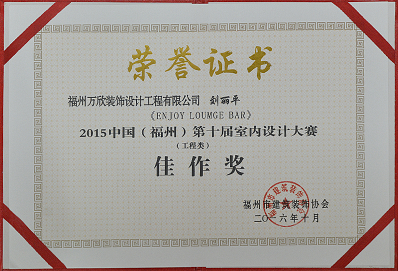 - >萬欣裝飾作品《ENJOY LOUMGE BAR》被評為中國(福州)第十屆室內(nèi)設(shè)計大賽(工程類)佳作獎